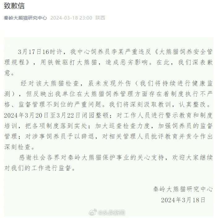 3月18日晚,秦嶺大熊貓研究中心發(fā)布致歉信稱,3月17日16時(shí)許,該中心飼養(yǎng)員李某嚴(yán)重違反《大熊貓飼養(yǎng)安全管理規(guī)程》,用鐵锨驅(qū)打大熊貓,造成惡劣影響。在此,秦嶺大熊貓研究中心深表歉意。