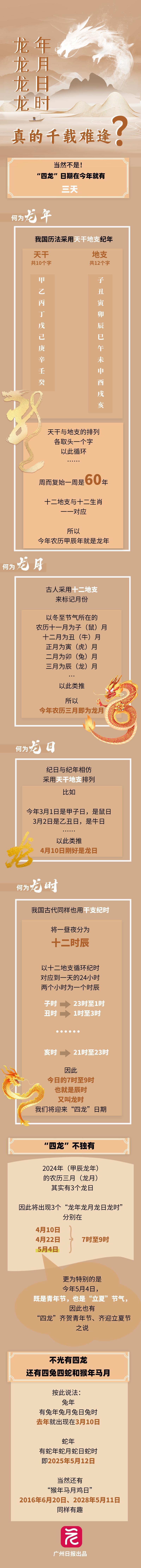 據(jù)介紹,今年共會出現(xiàn)3次“龍年龍月龍日龍時”,分別在4月10日、4月22日和5月4日的7時至9時,這是使用傳統(tǒng)干支和生肖紀法來標記年、月、日、時形成的有趣現(xiàn)象。