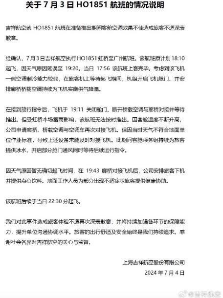 7月4日,上海吉祥航空股份有限公司發(fā)布關(guān)于7月3日HO1851航班的情況說明:吉祥航空就HO1851航班在準(zhǔn)備推出期間客艙空調(diào)效果不佳造成旅客不適深表收意。