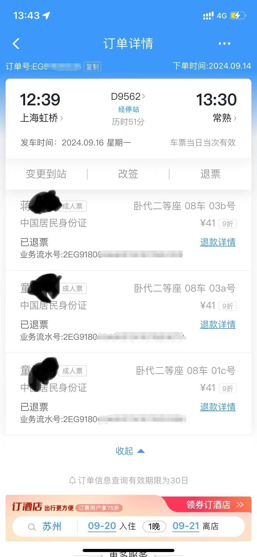 之后,童先生分別打了12345和12306詢問退票費(fèi)事宜。他表示:“9月16日當(dāng)天我就打了12345反映問題,中秋節(jié)最后一天我又打通了12306的客服熱線,他們就跟我解釋因?yàn)槲沂窍挛?點(diǎn)多到常熟的高鐵,第二天下午4點(diǎn)多從常熟返回上海,超過了24小時(shí),不在聯(lián)程車票可以免費(fèi)退票的規(guī)則里要收手續(xù)費(fèi)。因?yàn)榕_(tái)風(fēng)不可抗力,我希望他們以建議的形式反映給上面,管理部門可以研究一下這個(gè)事情,對(duì)于這種不可抗力應(yīng)該會(huì)有特殊的規(guī)定。如果是我個(gè)人的原因取消車次收退票費(fèi)是非常合理的,前序的服務(wù)沒有執(zhí)行,我只能是迫不得已才取消。”