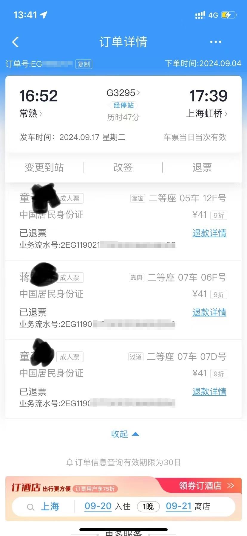 童先生接受采訪時(shí)說,他于9月2日為一家三口購買了9月16日G8282次上海至常熟的高鐵票,又于9月4日購買了9月17日返程的G3295次常熟至上海高鐵票。“9月14日我收到了12306的短信說上海到常熟的那班火車因?yàn)榕_(tái)風(fēng)原因取消了。我當(dāng)時(shí)上12306官網(wǎng)看了一下,好像取消的班次很少。”他說。