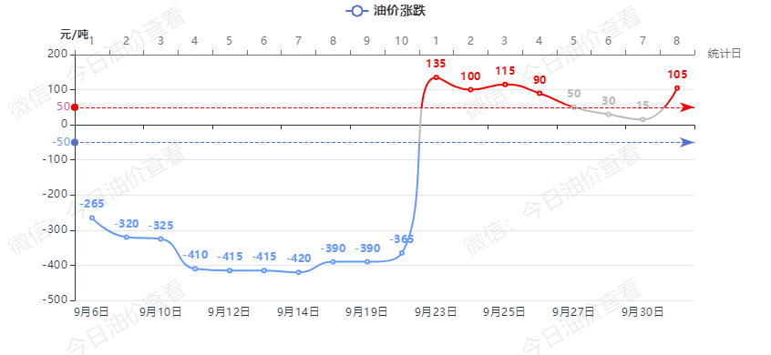 7日晚國際油價繼續(xù)大漲,布倫特原油和美油雙雙大漲近4個百分點,連續(xù)5天大漲,完全漲瘋了。從9月23日周期統(tǒng)計開始至今,原油變化率經(jīng)歷了多次波動。最初,第1個工作日時,參考原油變化率為3.11%,預計汽柴油上調(diào)135元/噸,折算后每升油價上漲約0.1—0.12元。隨后幾日,變化率有所回調(diào),但整體仍保持在上調(diào)預期內(nèi)。特別是在國慶假期期間,受國際油價大幅上漲的影響,油價上調(diào)預期再度增強。