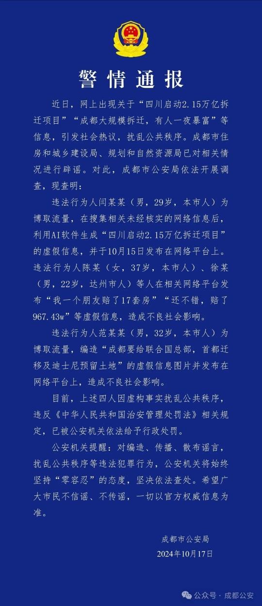 10月17日,成都公安微信公號(hào)發(fā)布關(guān)于“四川啟動(dòng)2.15萬(wàn)億拆遷項(xiàng)目”“成都大規(guī)模拆遷,有人一夜暴富”等信息的警情通報(bào)。