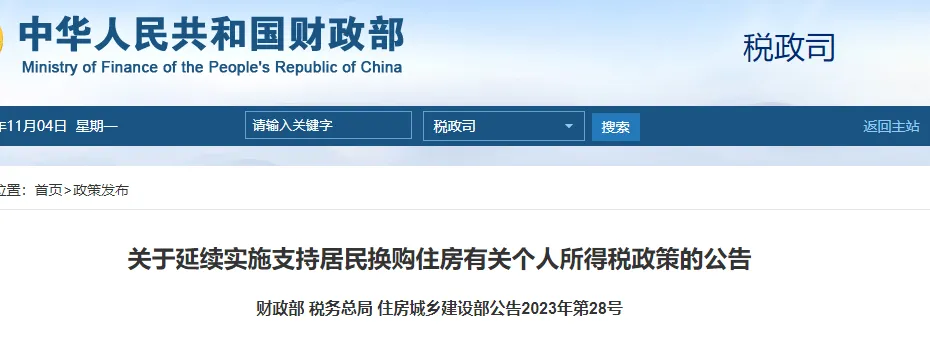 財政部、國家稅務(wù)總局、住房城鄉(xiāng)建設(shè)部發(fā)布公告:延續(xù)實施支持居民換購住房有關(guān)個人所得稅優(yōu)惠政策。