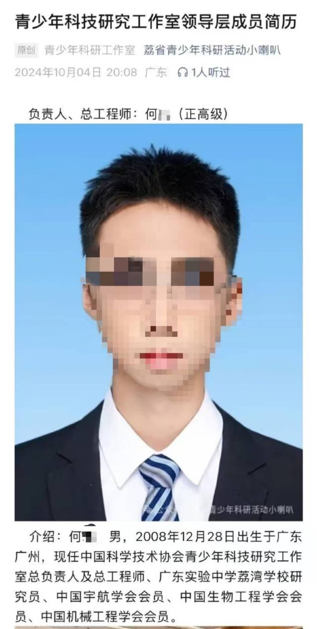 據(jù)名為“荔省青少年科研活動小喇叭”的微信公眾號發(fā)文稱:“何某,男,2008年12月28日出生于廣東廣州,現(xiàn)任中國科學技術(shù)協(xié)會青少年科技研究工作室總負責人及總工程師、廣東實驗中學荔灣學校研究員、中國宇航學會會員、中國生物工程學會會員、中國機械工程學會會員。”