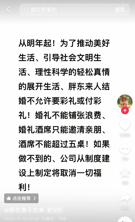 11月20日,胖東來(lái)創(chuàng)始人于東來(lái)在個(gè)人社交平臺(tái)發(fā)文,宣稱(chēng)從明年起,為了推動(dòng)美好生活、引導(dǎo)社會(huì)文明生活,胖東來(lái)人結(jié)婚不允許要彩禮或付彩禮,婚禮不能鋪張浪費(fèi),酒席不能超過(guò)五桌,不允許靠父母買(mǎi)房買(mǎi)車(chē)。如果做不到的,公司將從制度建設(shè)上制定取消一切福利。