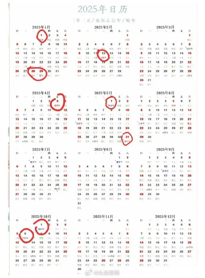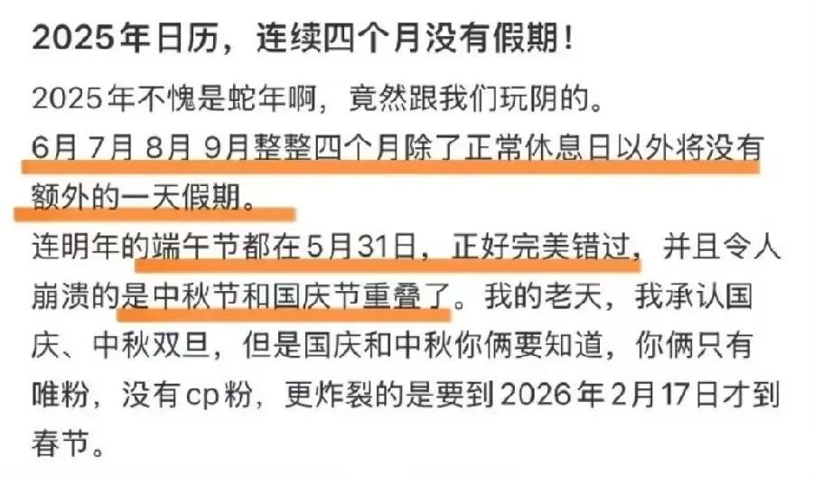 再往后看全年的假期,有網(wǎng)友發(fā)現(xiàn),2025年中秋節(jié)在10月6日,恰逢國(guó)慶長(zhǎng)假,而端午節(jié)在5月31日,這意味著明年6月~9月除周末外,整整4個(gè)月都沒(méi)有法定節(jié)假日。