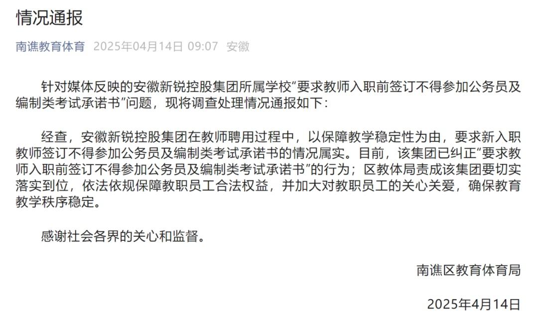 4月14日,安徽滁州市南譙區(qū)教育體育局發(fā)布通報:針對媒體反映的安徽新銳控股集團所屬學校“要求教師入職前簽訂不得參加公務(wù)員及編制類考試承諾書”問題,現(xiàn)將調(diào)查處理情況通報如下: