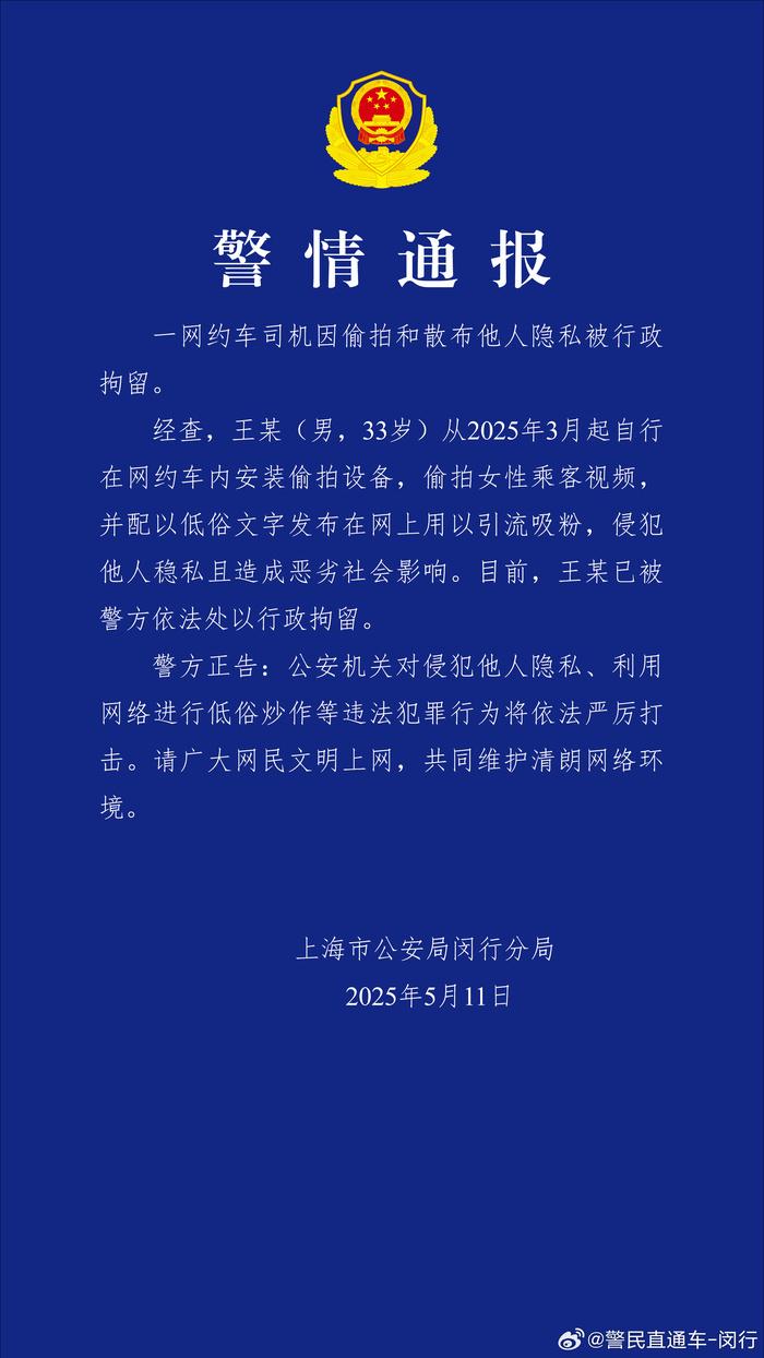 據(jù)@警民直通車(chē)-閔行 微博消息,5月11日,上海市公安局閔行分局發(fā)布警情通報(bào):一網(wǎng)約車(chē)司機(jī)因偷拍和散布他人隱私被行政拘留。
