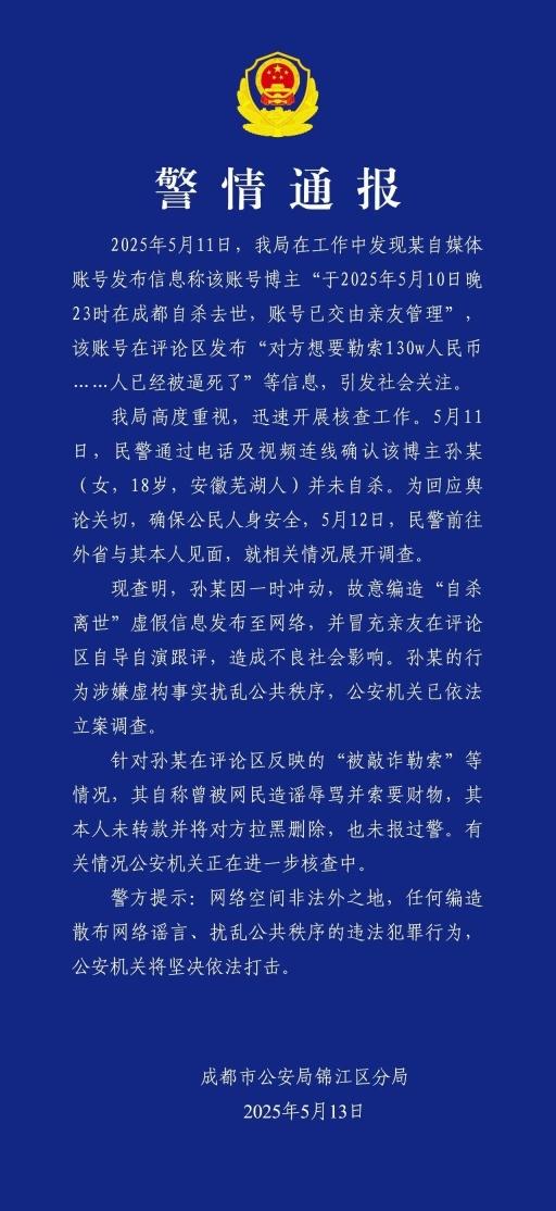 2025年5月11日,我局在工作中發(fā)現(xiàn)某自媒體賬號(hào)發(fā)布信息稱該賬號(hào)博主“于2025年5月10日晚23時(shí)在成都自殺去世,賬號(hào)已交由親友管理”,該賬號(hào)在評(píng)論區(qū)發(fā)布“對(duì)方想要勒索130w人民幣……人已經(jīng)被逼死了”等信息,引發(fā)社會(huì)關(guān)注。