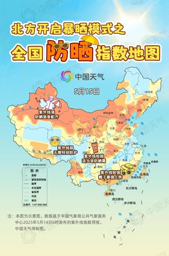從全國防曬指數(shù)地圖中可以看出,15日,新疆大部、內(nèi)蒙古中西部、甘肅、河北、北京、天津、遼寧中西部和湖北、云南西北部等地以晴為主,戶外紫外線強烈,防曬霜、遮陽帽、墨鏡、防曬服等裝備都可以用起來,主打一個“全方位遮陽”;而安徽、江蘇、江西北部、四川西部、西藏中東部、黑龍江東部等地受降雨影響,紫外線弱,無需特別防護,若長期在戶外,建議涂抹低倍防曬護膚品。