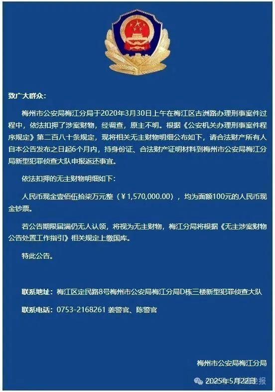 5月22日,廣東梅州市公安局梅江分局發(fā)布公告稱,該局于2020年3月30日上午在梅江區(qū)古洲路辦理刑事案件過程中,依法扣押了涉案財(cái)物,經(jīng)調(diào)查,原主不明。