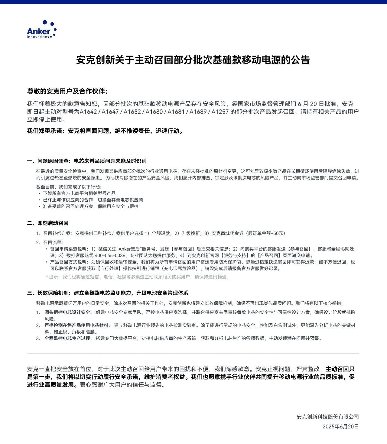 6月20日,@安克創(chuàng)新 發(fā)布關(guān)于主動(dòng)召回部分批次基礎(chǔ)款移動(dòng)電源的公告。公告稱,因部分批次的基礎(chǔ)款移動(dòng)電源產(chǎn)品存在安全風(fēng)險(xiǎn),經(jīng)國(guó)家市場(chǎng)監(jiān)督管理部門(mén)6月20日批準(zhǔn),安克即日起主動(dòng)對(duì)型號(hào)為A1642/A1647/A1652/A1680/A1681/A1689/A1257的部分批次產(chǎn)品發(fā)起召回,請(qǐng)持有相關(guān)產(chǎn)品的用戶立即停止使用。