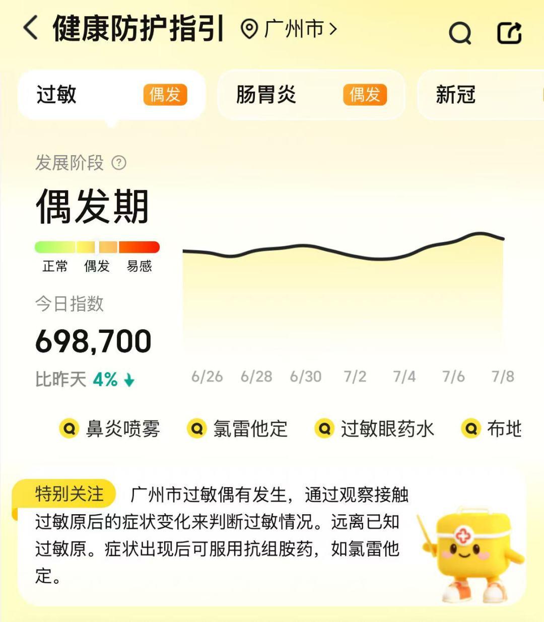 美團買藥發(fā)布的廣州健康防護指引提示:當前過敏偶有發(fā)生,癥狀出現(xiàn)后可以服用抗組胺藥,如氯雷他定等;急性腸胃炎也偶有發(fā)生,可以使用口服補液鹽、止瀉藥,如蒙脫石散等緩解不適。