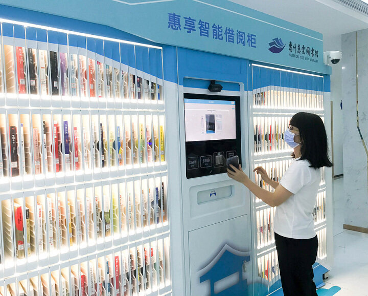 讀者在市民服務(wù)中心操作“惠享智能借閱柜”借閱書籍。