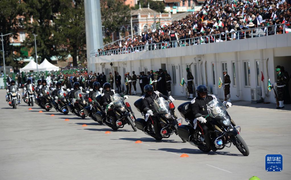 6月26日,在馬達(dá)加斯加首都塔那那利佛,馬達(dá)加斯加警察摩托車方陣接受檢閱。