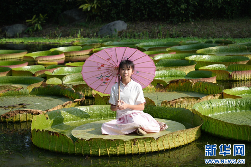 盛開的王蓮可托起小朋友。新華網發(fā)(全碧芳 攝)
