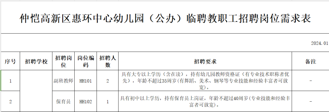 2024年1月仲愷高新區(qū)惠環(huán)中心幼兒園(公辦)臨聘教職工招聘