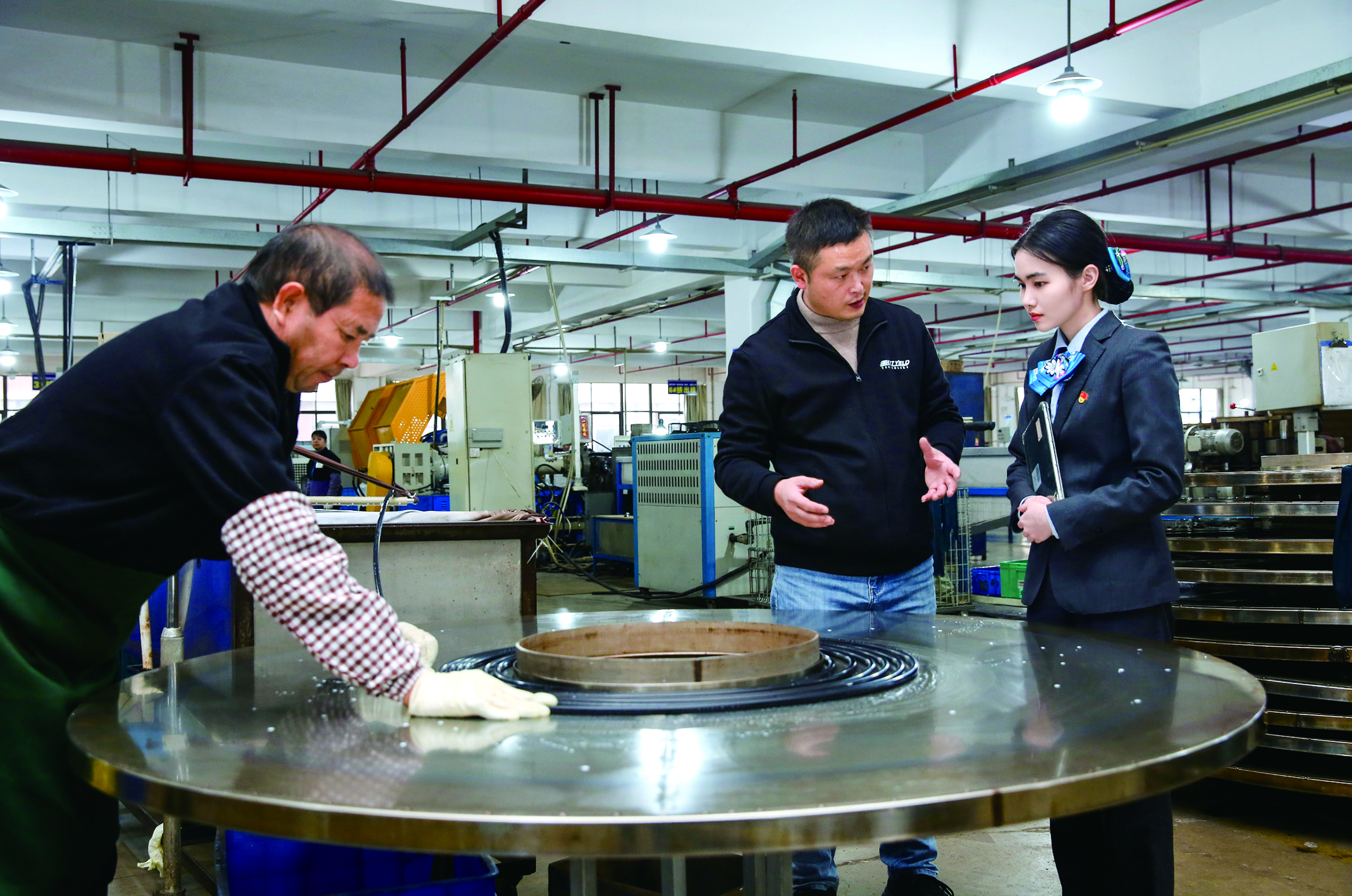 在佳潤科技生產(chǎn)車間內(nèi),惠州農(nóng)行工作人員了解企業(yè)生產(chǎn)情況。 惠州農(nóng)行供圖