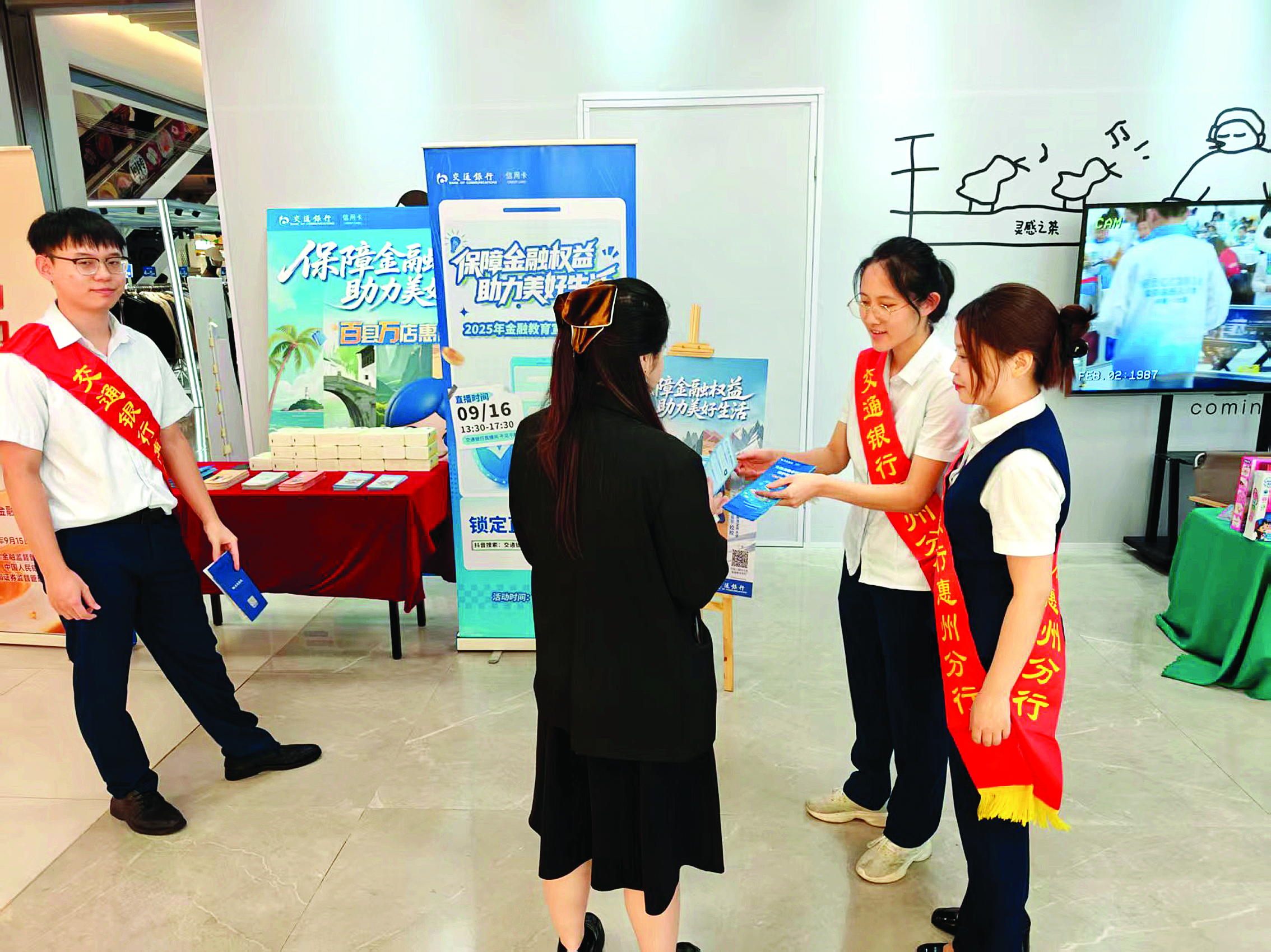 惠州日報訊 (記者伍磊)為深入貫徹落實國家關(guān)于金融消費者權(quán)益保護工作的決策部署,切實提升社會公眾金融素養(yǎng)和風險防范能力,9月17日,交通銀行惠州分行在惠州華貿(mào)天地舉辦金融教育集中宣傳活動。舉辦此次活動是交通銀行惠州分行在2025年金融教育宣傳周期間的重要舉措。宣傳周期間,該行緊緊圍繞“保障金融權(quán)益 助力美好生活”主題,積極依托“百縣萬店惠民生”活動,組織開展了一系列金融教育宣傳活動,以實際行動踐行“金融為民”理念,讓金融服務(wù)更加貼近百姓、更有溫度。