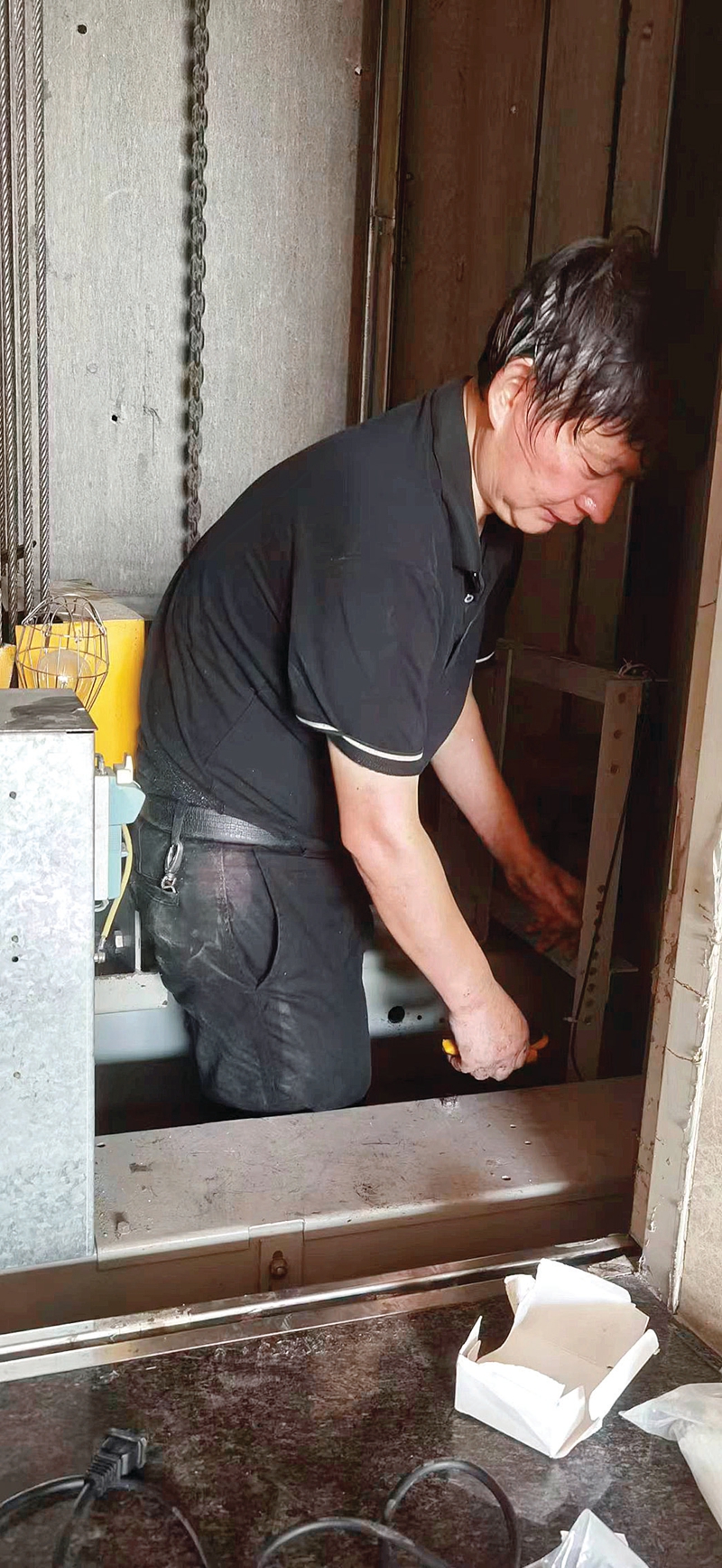 工程師在促狹高溫的空間維修電梯。朝聞 攝