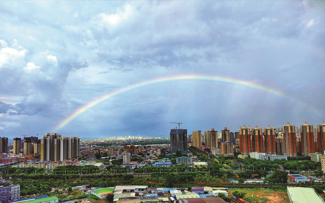 8月11日15時48分,惠州市氣象臺發(fā)布惠城區(qū)暴雨黃色預警信號。17時許,一場短暫暴雨過后,一道彩虹出現(xiàn)在市區(qū)江北天空,不少路人紛紛停下腳步記錄這一時刻,大約5分鐘后彩虹漸漸消失。