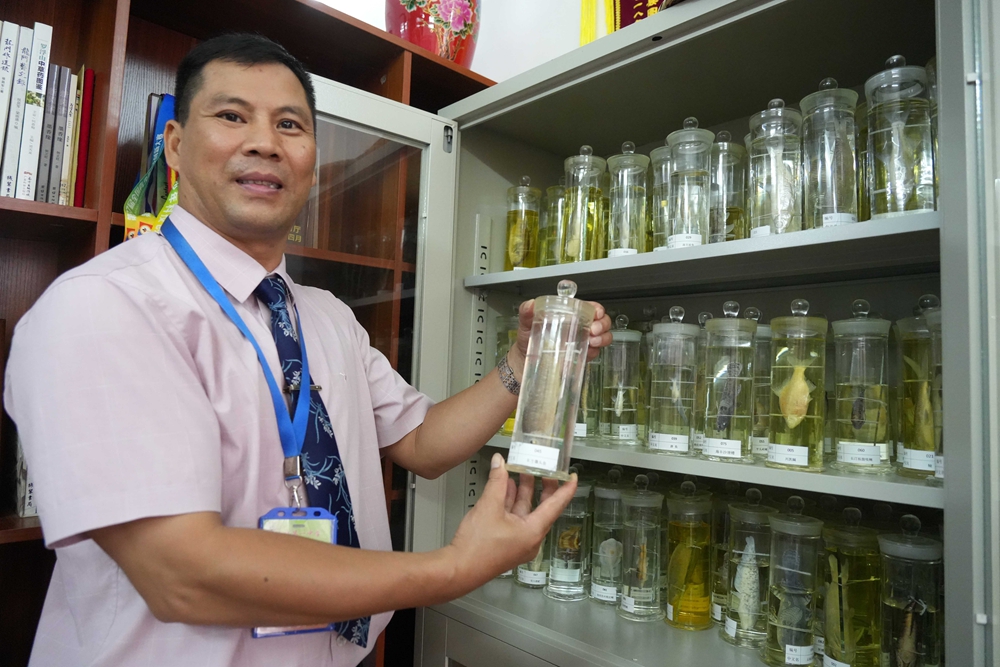 龍門縣龍城第一中學特級生物教師黃偉勝,主持龍門縣原生魚資源調查研究課題,收集105種龍門原生魚。圖為他自制的各種魚標本。