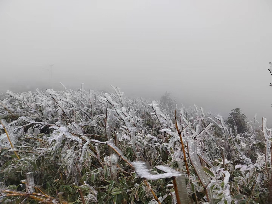 除羅浮山之外,象頭山的海拔高處也進(jìn)入了奇幻的“冰雪世界”。樹枝、綠葉等被冰層包裹著,猶如冰雕藝術(shù)品。
