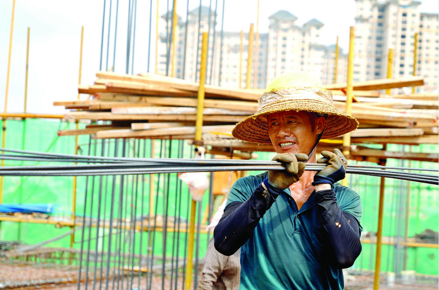 市中心人民醫(yī)院金山院區(qū)一期項目施工現(xiàn)場,工人頭頂烈日忙施工。惠州日報記者李松權(quán) 攝