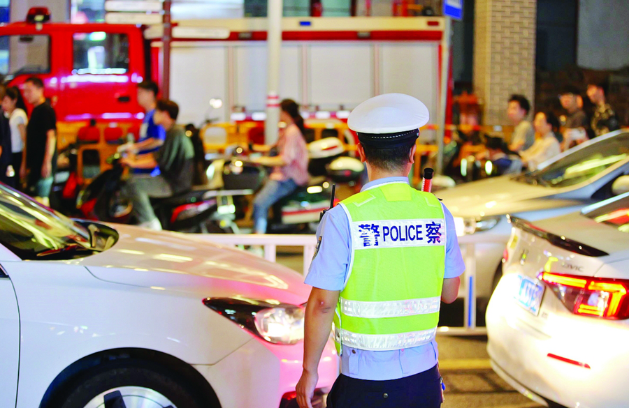 交警在市區(qū)水東街執(zhí)勤確保交通順暢。惠州日報記者黃鑫威 攝