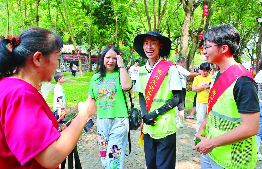 惠州文明旅游志愿者在西湖景區(qū)服務(wù)游客。惠州日報記者鐘暢新 攝