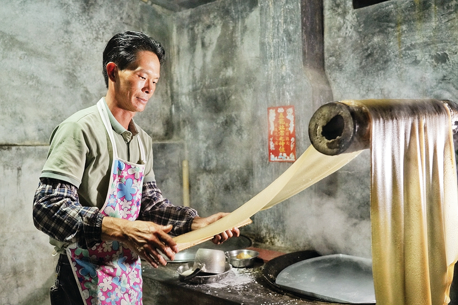 “我家鄉(xiāng)的薯粉絲都是手工制作,口感柔滑筋道。我的祖輩父輩都是靠制作粉絲養(yǎng)家糊口的,到了我們這一代,就想把小粉絲做成大產(chǎn)業(yè),帶動(dòng)村里更多人致富。”元嶺村村民吳海岸介紹,他們一般選用檳榔薯作為制作薯粉絲的原材料。每年6~7月種下種苗,11月收成后,村民們會(huì)把番薯碾磨成粉并調(diào)成薯漿,過濾后倒入大水池經(jīng)過兩次沉淀,將淀粉提純后拌漿、再沉淀。吳海岸介紹,拌漿是個(gè)技術(shù)活,淀粉與水的比例必須分毫不差,水少蒸出的粉皮過硬,水多則稀,蒸不出粉皮。