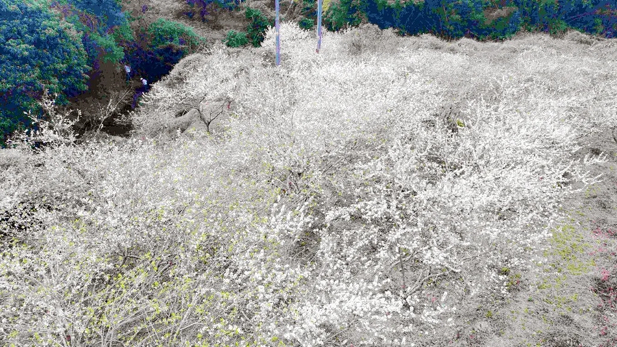 站在遠(yuǎn)處望去,李子園里白茫茫的一片。沿著山邊、溪邊,呈帶狀分布的大片李花,如一條大大的白絲帶般飄逸,裝飾著溪澗、林間。