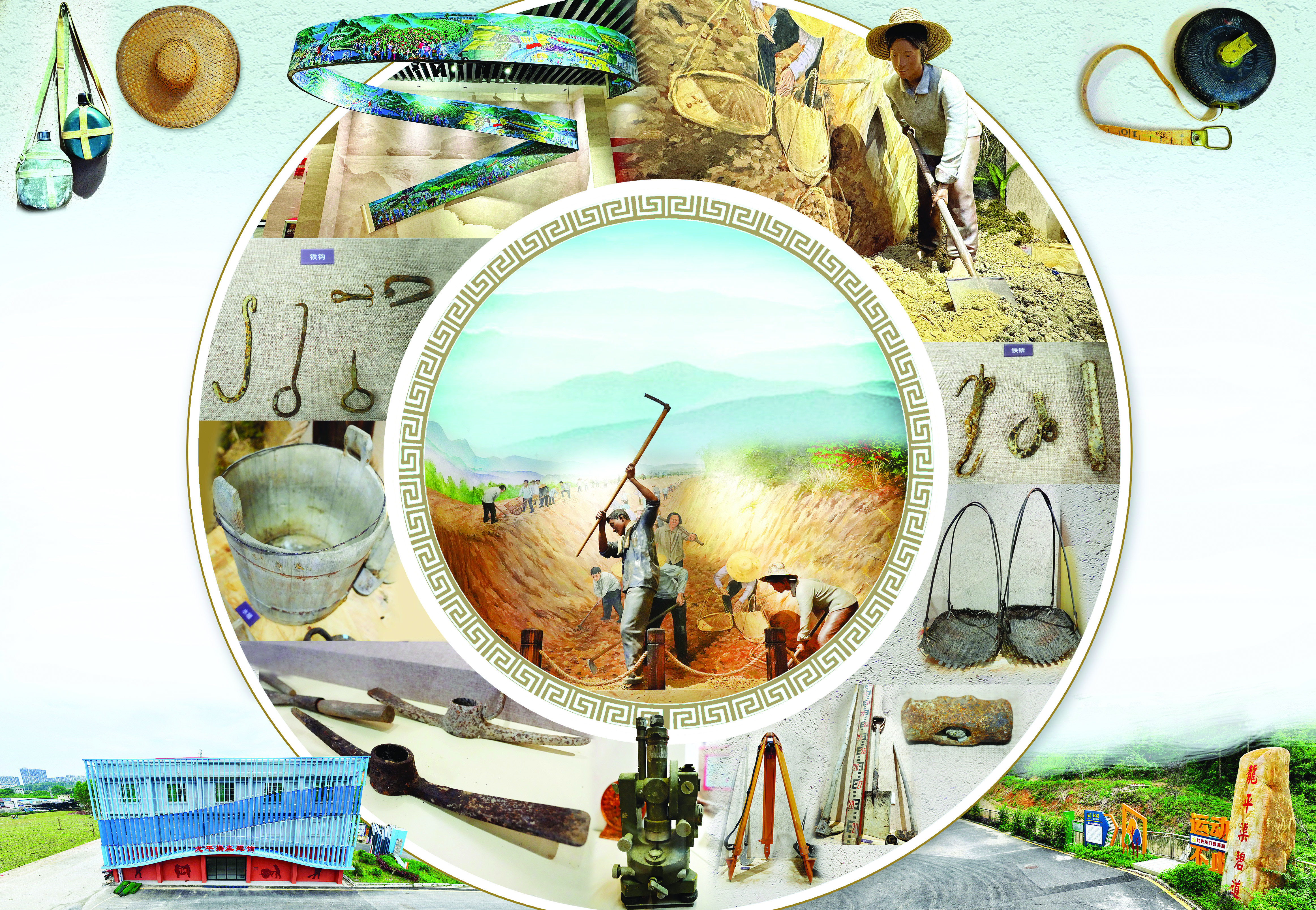 水壺。 竹編帽。 以農(nóng)民畫(huà)長(zhǎng)卷展現(xiàn)修建過(guò)程。 鐵鉤。 水桶。 番釘。 “萬(wàn)人大會(huì)戰(zhàn)”場(chǎng)景還原修渠歷史現(xiàn)場(chǎng)。 水準(zhǔn)測(cè)量?jī)x。 以雕塑展示勞作場(chǎng)景。 鐵錛。 糞箕。 鐵錘。 水位測(cè)量?jī)x。 RTK測(cè)量?jī)x。 龍平渠主題館外觀。 皮尺。 龍平渠碧道。