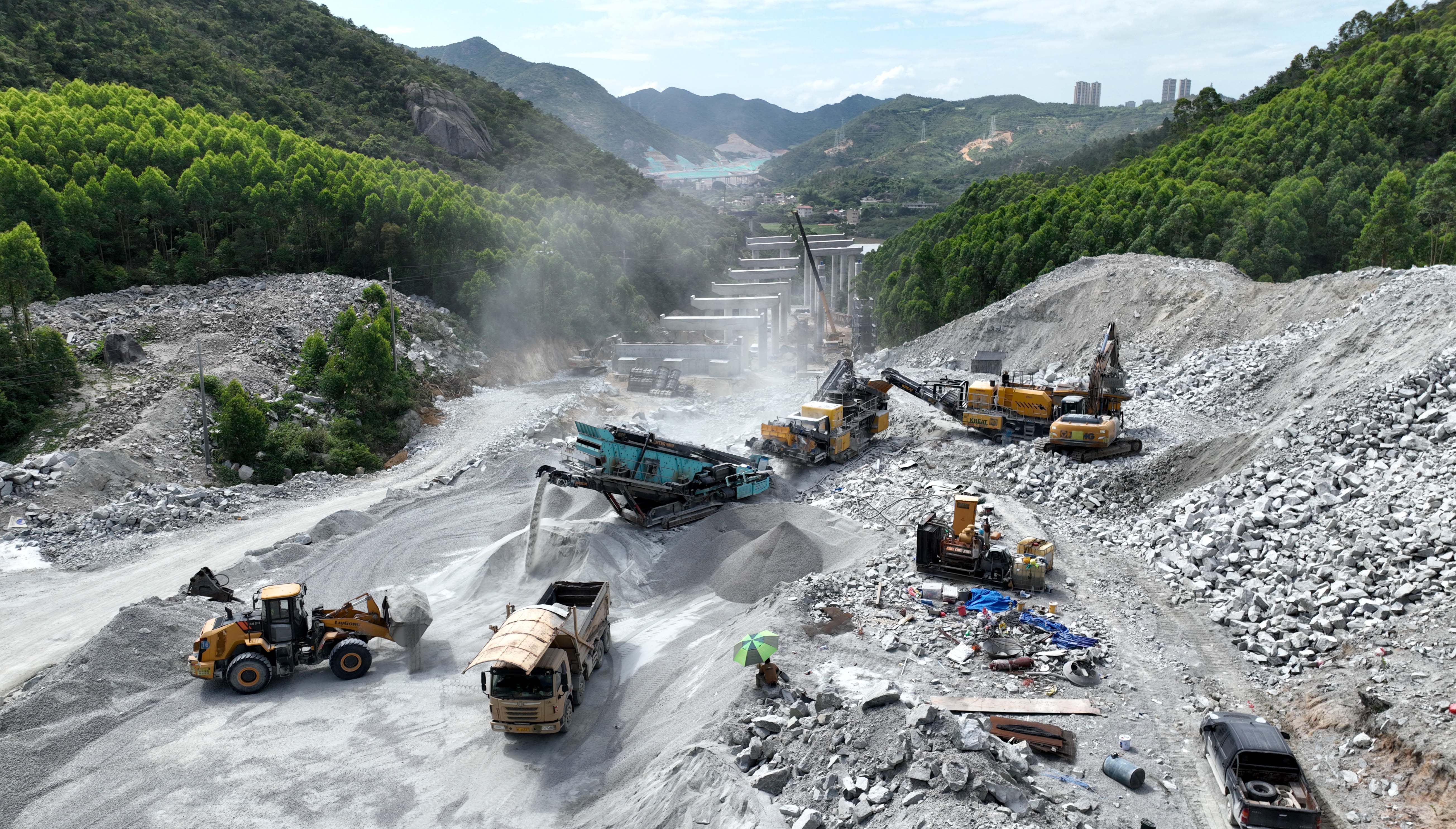惠州稔平環(huán)島高速項目施工現(xiàn)場,工程機械在緊張忙碌地開展作業(yè)。