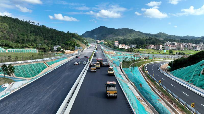 惠州稔平環(huán)島高速赤砂互通立交路段在鋪設瀝青。