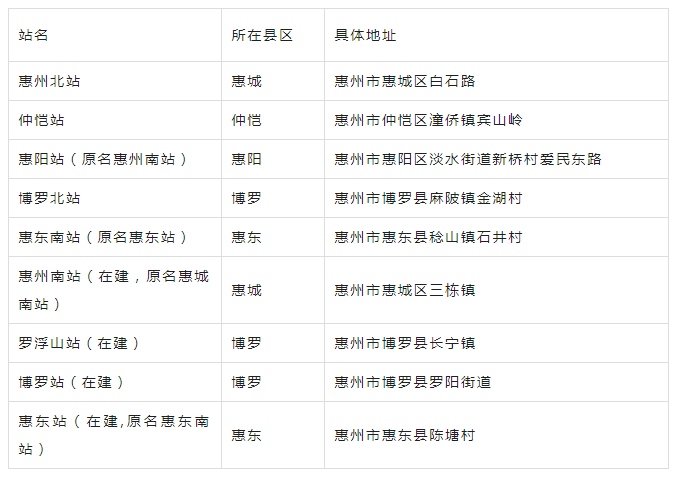下面一個表格告訴大家,惠州各高鐵站地址及名稱。