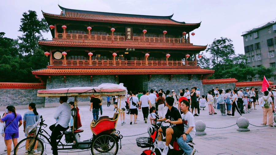 牌坊下的騎樓里,是熱鬧的商家,這里有現(xiàn)代的奶茶、餐飲、小百貨,也有傳承多年的老字號、傳統(tǒng)特產(chǎn)。繁榮的店面間,偶爾可見古城居民或在自家門前悠閑納涼,或三五好友在巷口支起小桌飲茶聊天。一路走走逛逛,逛累了,坐上一輛黃包車,時而在古城中心的人潮中穿梭,時而轉(zhuǎn)進(jìn)一條小巷遠(yuǎn)離了喧囂。奶茶鋪、餅家、便利店、潮州府、駙馬府……坐著這么一輛黃包車,看盡了老街上商家的繁華,走遍了老城里的文化傳承,也感受到了古城居民生活的閑適,各種各樣的生活狀態(tài)呈現(xiàn)于城內(nèi),生動詮釋了“繁華市井生活”。