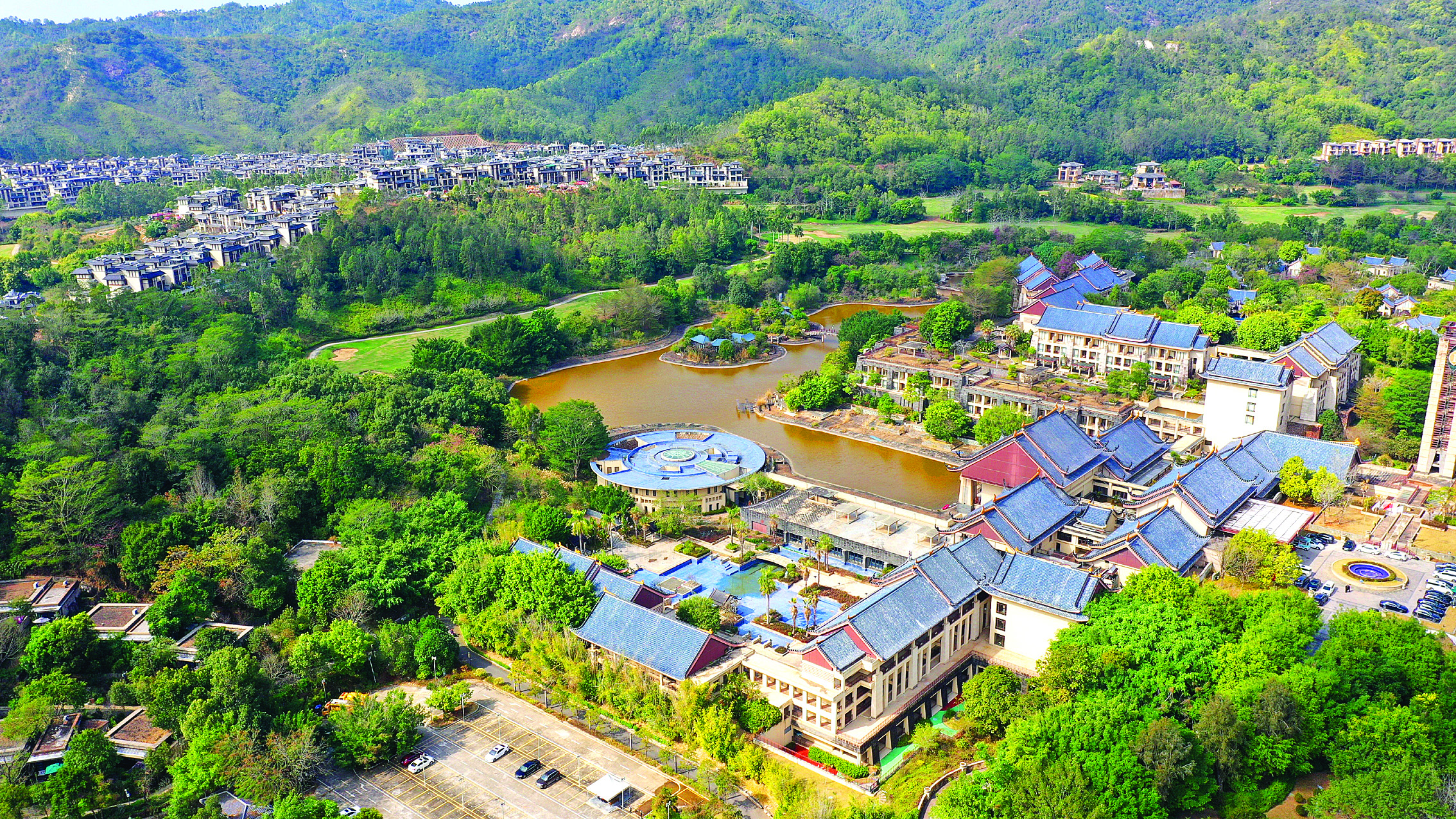 富力惠林溫泉所在的黃沙洞村,四面環(huán)山,綠道蜿蜒,植被茂盛,不僅自然風光優(yōu)美,還是惠城區(qū)有名的“溫泉村”。這里地熱資源豐富,溫泉分布面積約500畝。正是看中這里的特色資源,富力集團在此投資打造了惠林溫泉度假區(qū)。度假區(qū)配套惠州洲際度假酒店、富力惠林莊園、山地運動公園、兒童主題公園、櫻花谷等,集山林、溪谷、溫泉于一體,游客來到這里不僅可以泡溫泉緩解疲憊,還可以欣賞滿山層林的大自然風光。
