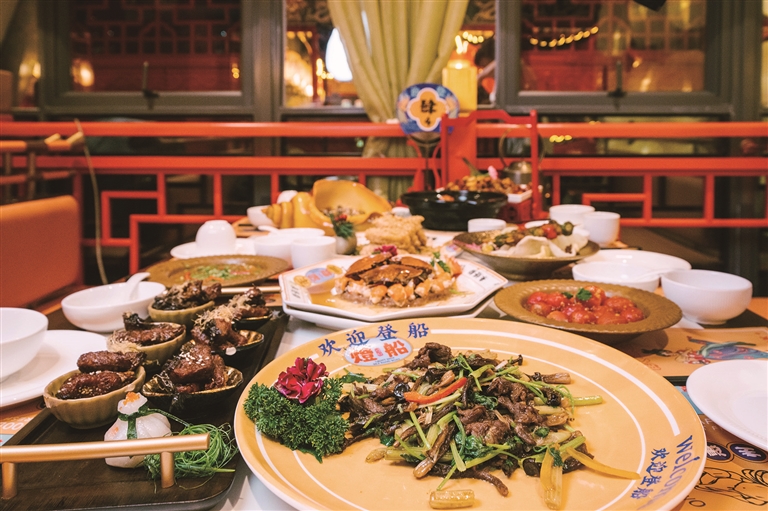 一封“圣旨”,暗含玄機(jī)。蟹肉咸蛋肉餅、玉環(huán)炒脆肉、鹵汁五頭鮑、涼拌鯊魚皮、將軍海膽炒飯……一道道美味佳肴隨著“圣旨”展開,這一份獨(dú)特的菜單之內(nèi)是伴隨著一代惠州人成長的專屬于喜碧海鮮的好味道。惠州宴飲文化與大唐文化在此深度融合,如金風(fēng)玉露相逢,讓“燈船”大唐不夜城在“好玩”之余更“好食”。