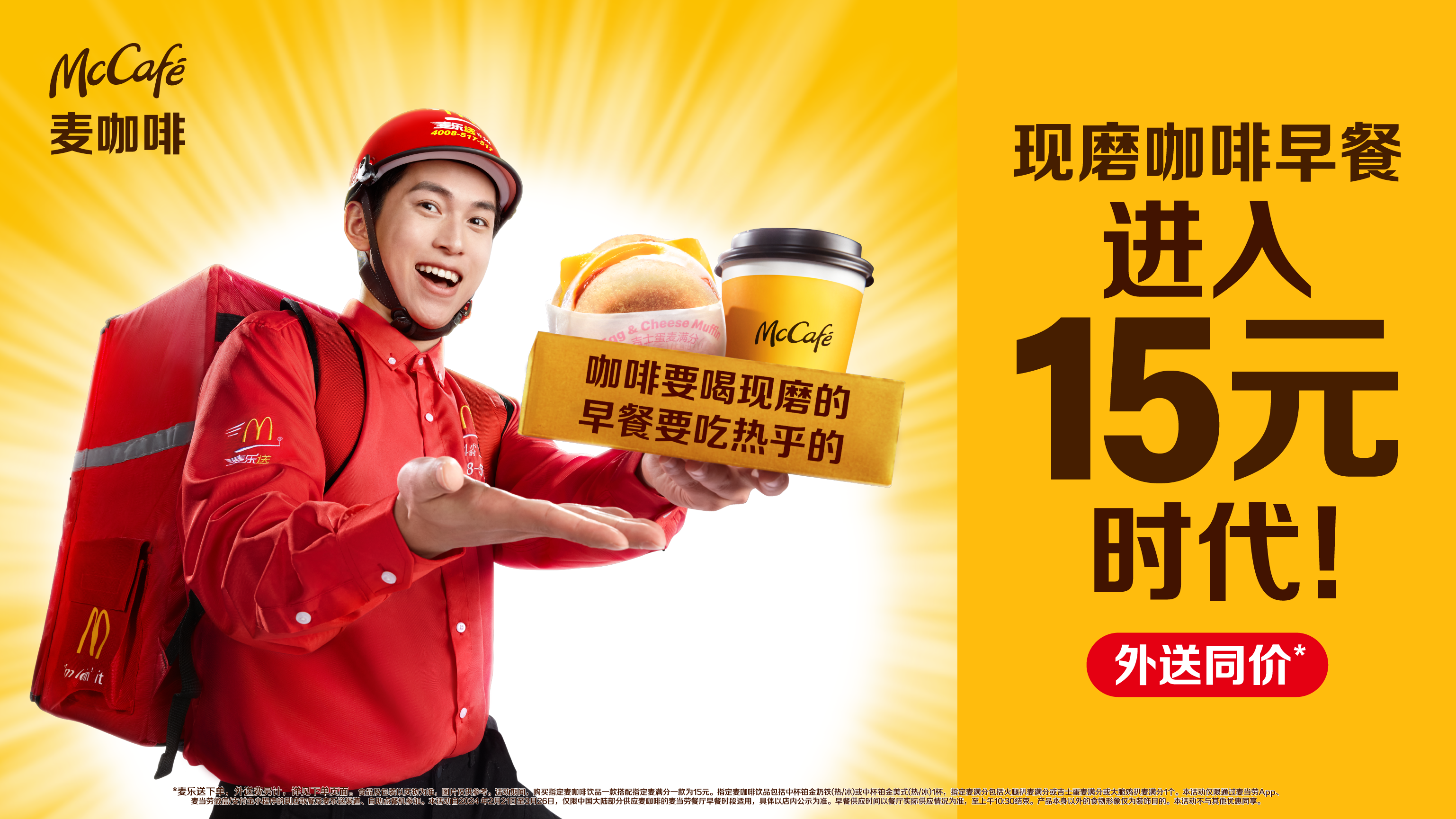2024年2月21日,麥當勞中國宣布推出全新15元現(xiàn)磨咖啡早餐組合,以麥咖啡鉑金豆現(xiàn)磨咖啡搭配早餐當家產(chǎn)品麥滿分,引領(lǐng)現(xiàn)磨咖啡早餐進入高品質(zhì)與高性價比兼得的“15元時代”。每天早餐時段,顧客可以在堂食和外送服務(wù),同享這一天天15元的高品質(zhì)早餐組合。