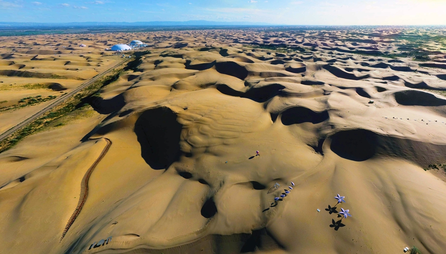 在蒙語中,響沙灣被稱為“布熱芒哈”,意為“帶喇叭的沙丘”。這里的沙丘綿延不斷,更令人詫異的是,這里的沙子會“唱歌”。沙子干燥時,游客攀著軟梯,或乘坐纜車登上“銀肯”沙丘頂,再往下滑溜,沙丘會發(fā)出轟隆聲。