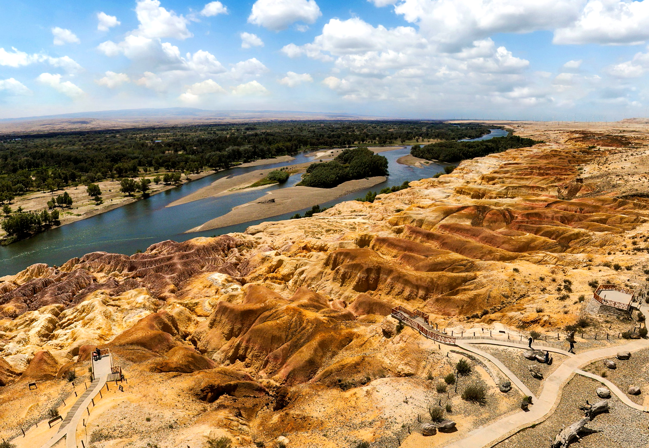 額爾齊斯河畔的雅丹奇跡。一河隔開,南岸是郁郁蔥蔥的河谷胡楊林,北岸則是色彩絢麗的懸崖式雅丹地貌。尤其在日落時分,夕陽的余暉為這些由紫紅、土紅、淺黃、淺綠等泥巖、砂巖構成的石丘披上最華美的外衣,光影流轉,色彩斑斕,宛如上帝打翻的顏料盤,流淌在壯闊的天地之間。