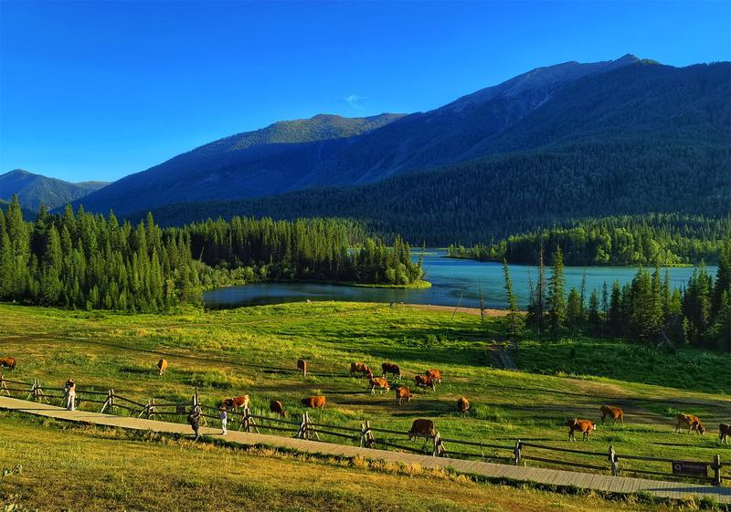 天山懷抱中的高山冷水湖。湖水清澈見底,透明度極高,在陽光照耀下呈現(xiàn)出令人心醉的藍(lán)。湖畔是遼闊的高山草甸,夏季野花如繁星點綴,秋季牧草金黃。遠(yuǎn)處雪山連綿,倒映在如鏡的湖面上,牛羊悠然漫步,構(gòu)成一幅寧靜致遠(yuǎn)的絕美畫卷,“凈海”之名,名副其實。