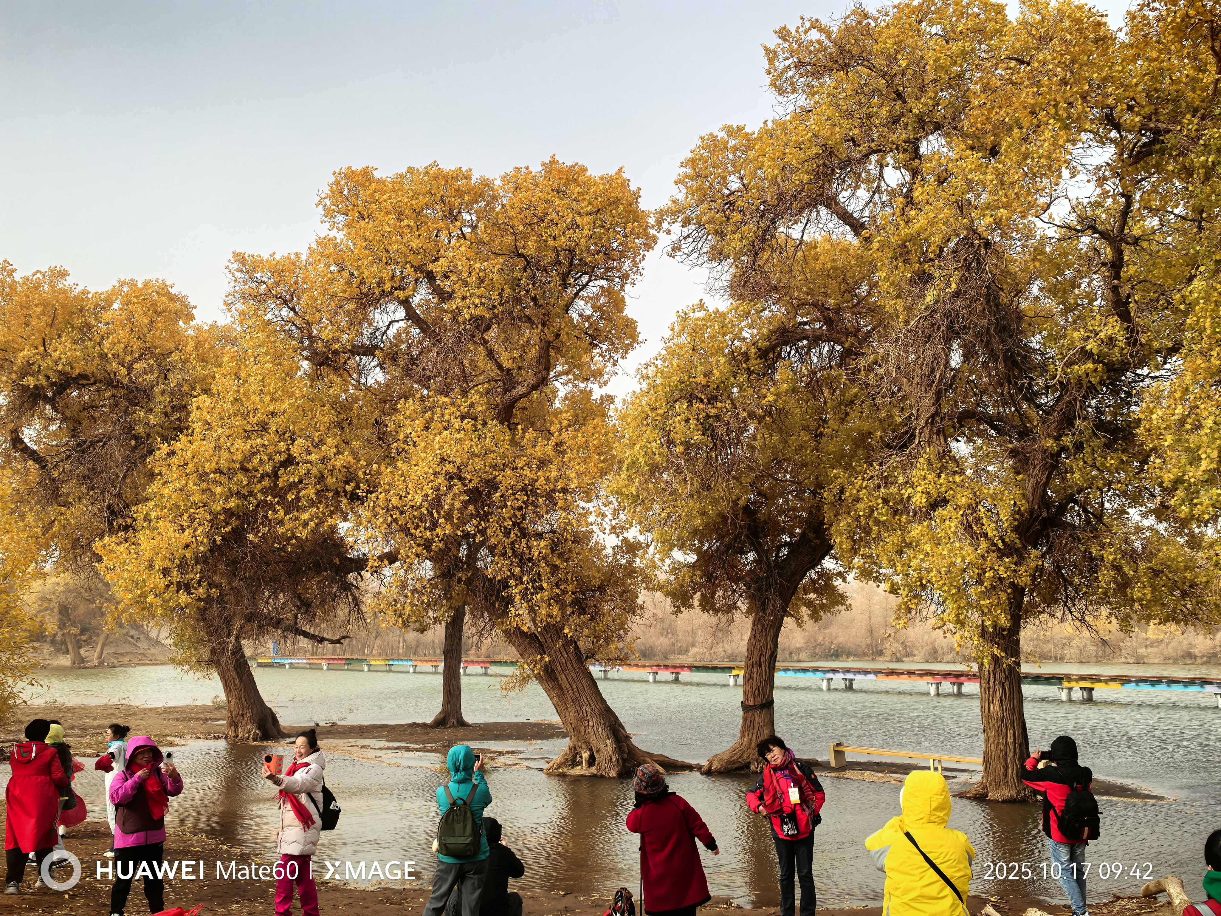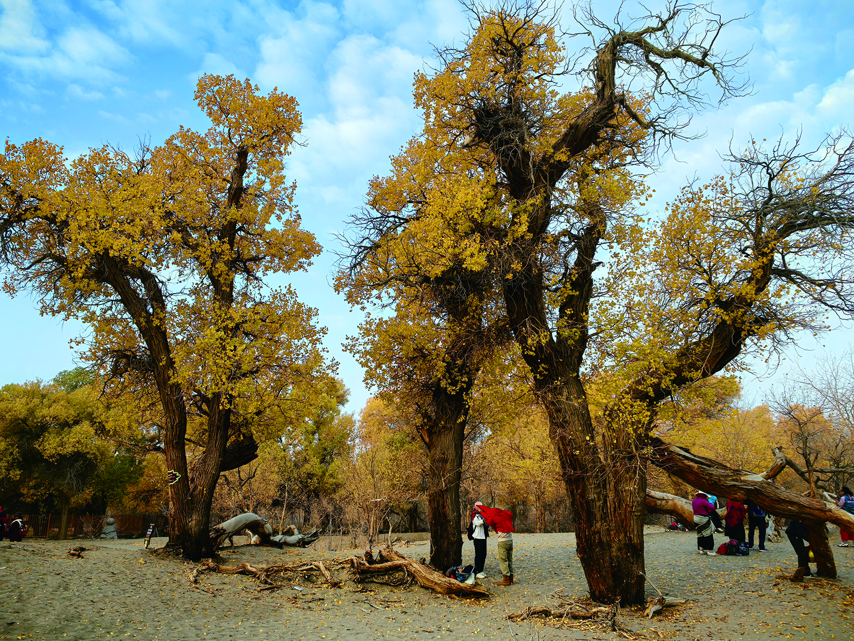 按照行程安排,他們先探訪了額濟(jì)納旗八道橋胡楊林景區(qū)。“從一道橋到四道橋,每道橋景色都不一樣。”郭金和回憶,二道橋的水中胡楊林最是秀美,金色的胡楊倒映在黑河中,波光與樹影交織;四道橋被稱為“英雄林”,千年胡楊樹干粗壯、形態(tài)蒼勁。