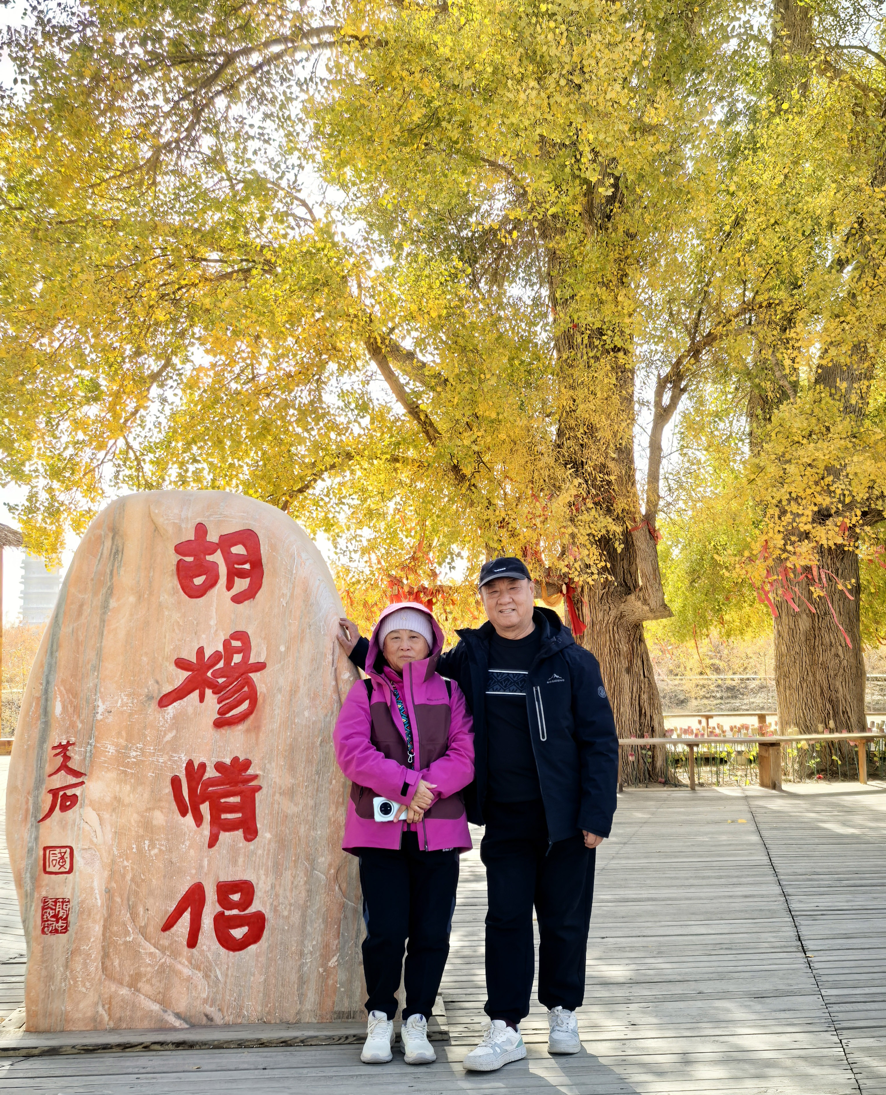 郭金和夫婦在胡楊情侶樹下合影。 代立梅 攝
