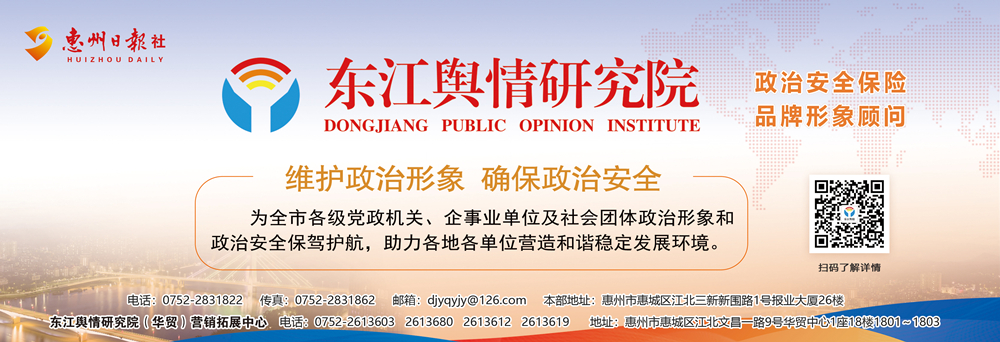 東江輿情研究院作為惠州日報社智庫平臺,自2018年成立以來按照“政治安全保險,品牌形象顧問”的定位,健全完善輿情監(jiān)控采集、研判預警,應對處置,負面修復和效果運用的全鏈條生態(tài)體系,全面提供輿情監(jiān)控應對、專項課題調(diào)研報告撰寫和舉辦大型輿情專題培訓班等服務,充分彰顯政治效益、社會效益、品牌效益、文化效益和經(jīng)濟效益。