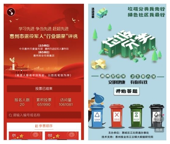惠州東江數(shù)字文化科技有限公司自創(chuàng)辦以來,多次與惠州市各企事業(yè)單位合作開展網(wǎng)絡(luò)知識競賽和網(wǎng)絡(luò)投票等活動,開發(fā)了一批線上網(wǎng)絡(luò)互動應(yīng)用。其中包含“惠州核酸檢測地圖”便民服務(wù)平臺、“抗疫情·講科學(xué)·反邪教”網(wǎng)絡(luò)知識競賽、“最美隆生”攝影投票大賽、“六治協(xié)同·平安博羅”攝影大賽、“惠州市退伍軍人行業(yè)明星”投票活動、“建黨100周年黨史學(xué)習(xí)教育”網(wǎng)絡(luò)知識競賽、“垃圾分類我先行 綠色分類我最行”垃圾分類競賽等。